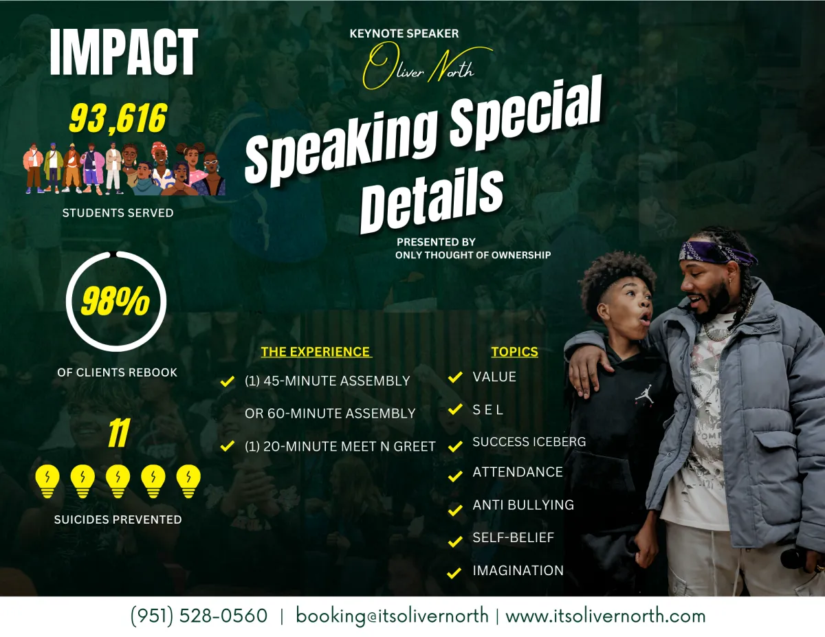 Since 2014, Oliver has been a leading cultural expert, educator, and speaker, addressing mental health in communities in the inland empire and surrounding areas. His organization also provided Optimal Health Relationship Education via a federally funded grant and serviced 13,562 students in the middle of a national pandemic and continues to be the leading expert in this area.